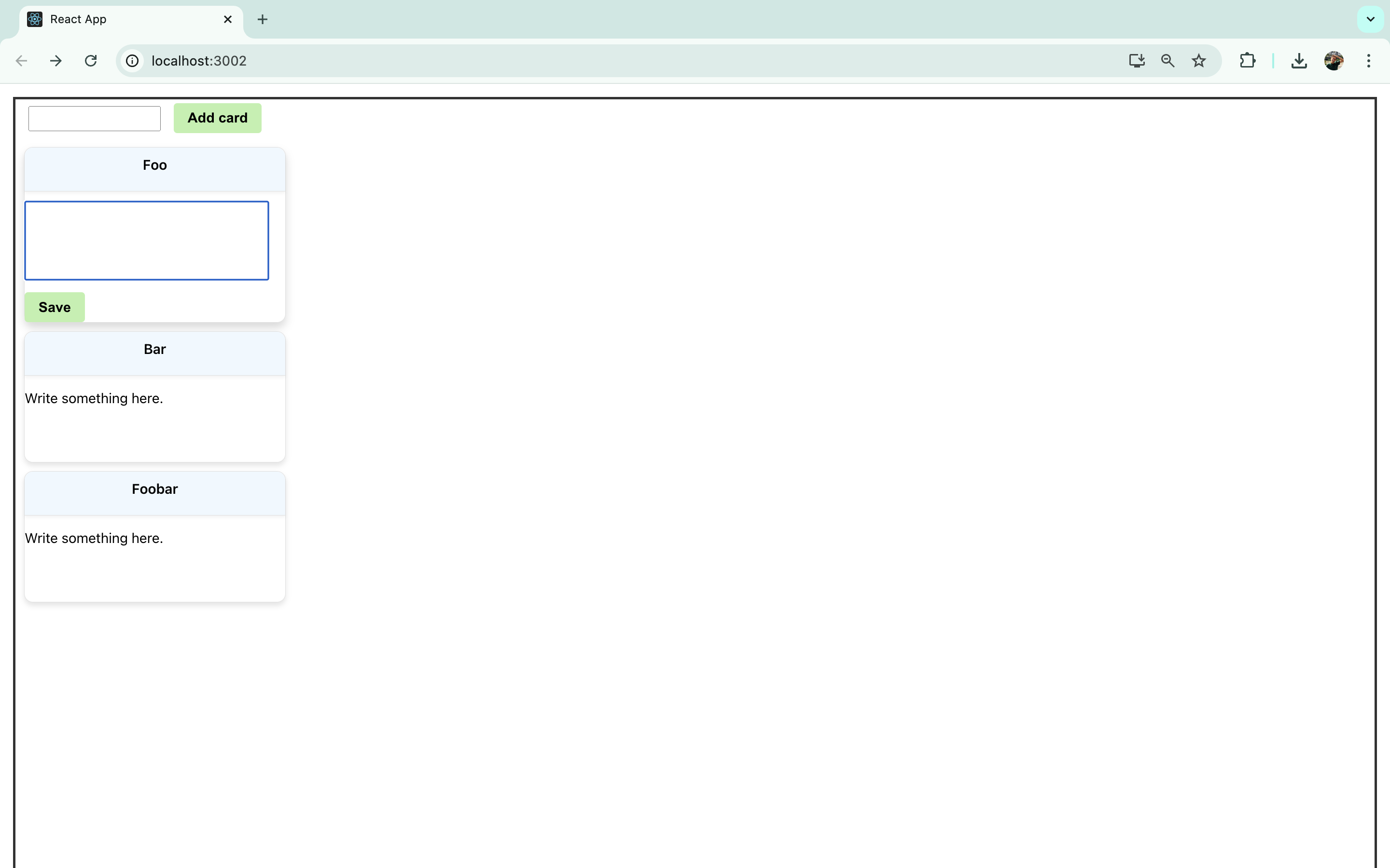 const [cards, setCards] = useState([{title: "Foo", id: 0}, {title: "Bar", id: 1}, {title: "Foobar", id: 3}]);