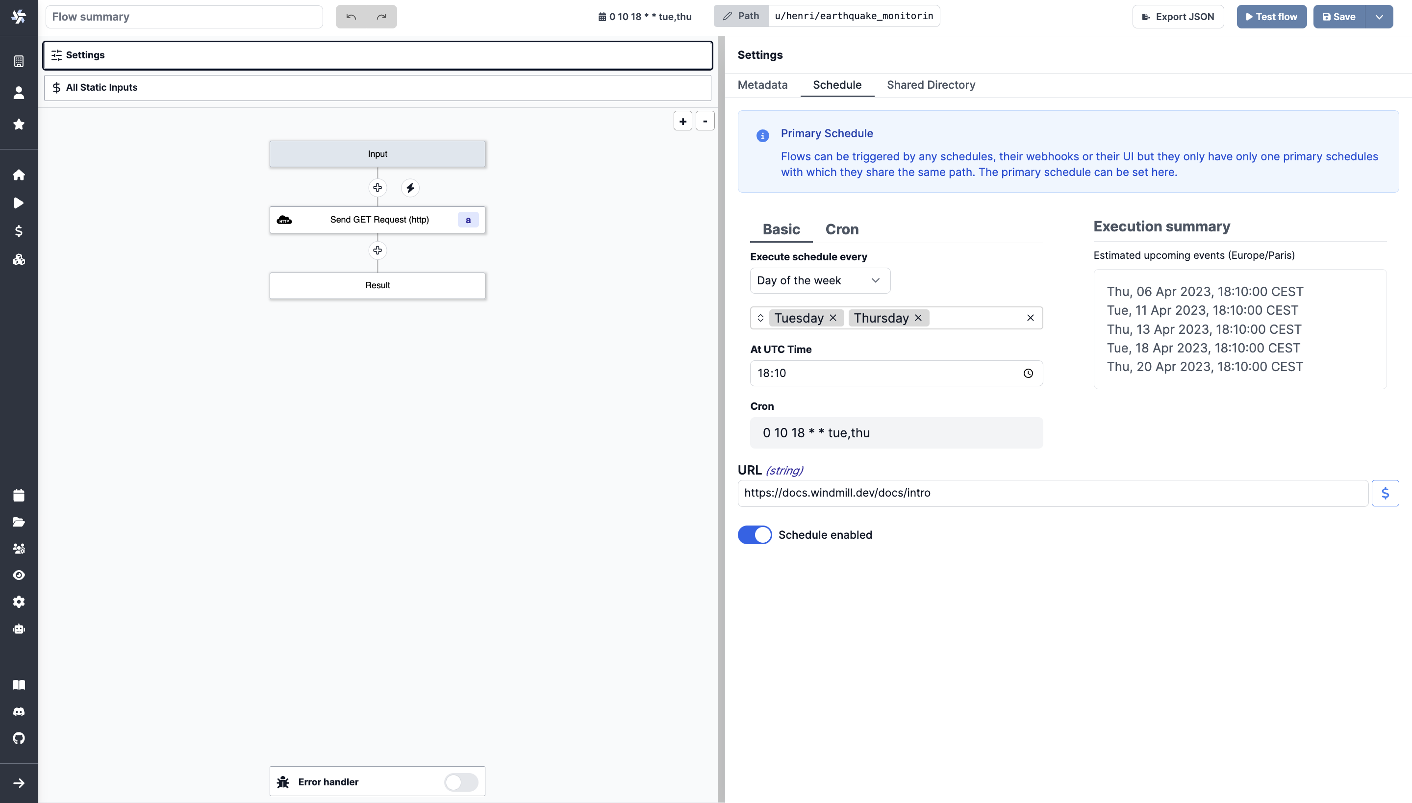 Windmill addresses these issues with schedules that can be defined with pre-set configuration for scripts and flows.