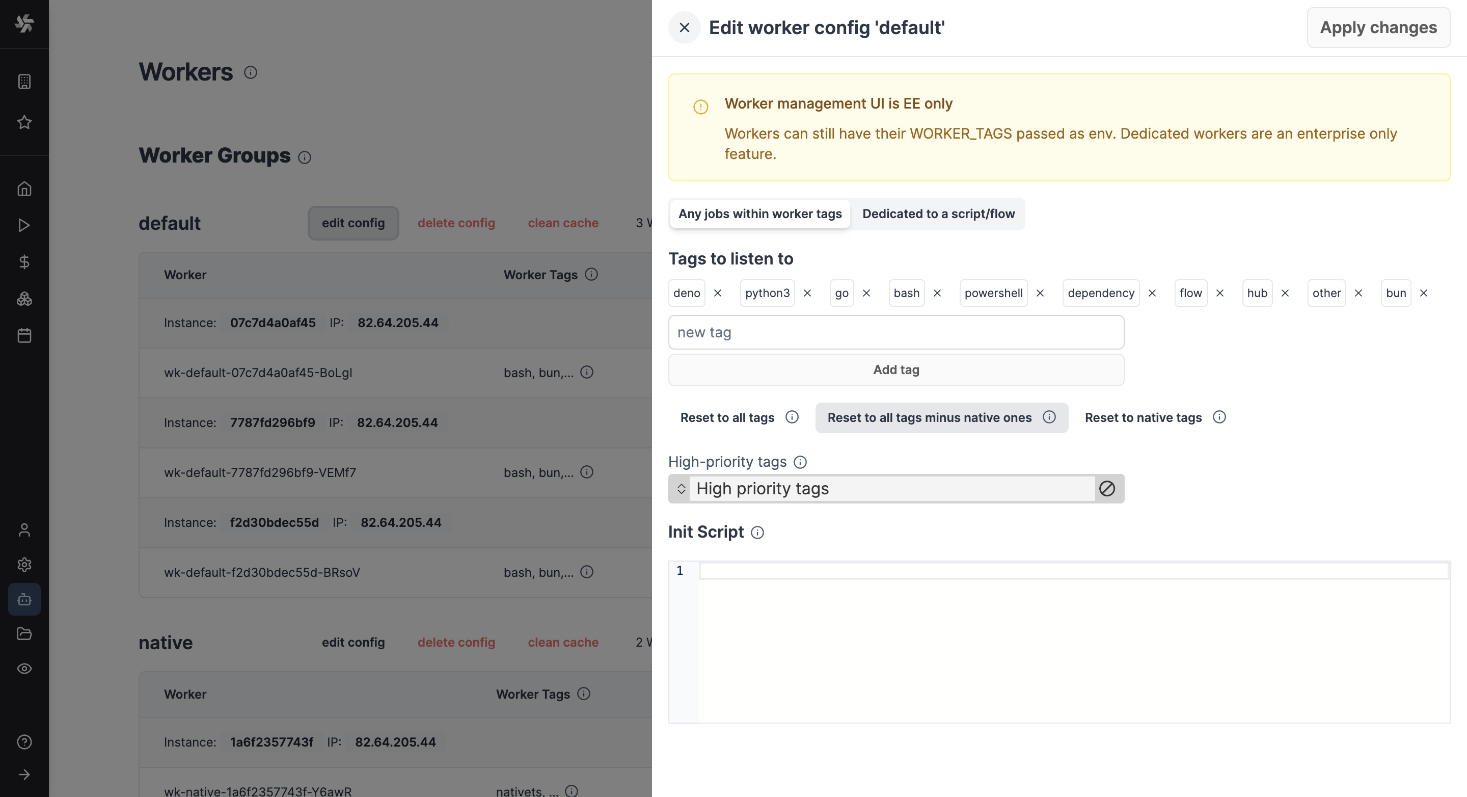 In the Cloud plans & Self-Hosted Enterprise Edition, workers can be commonly managed based on the group they are in, from the UI. Specifically, you can group the workers into worker groups, groups for which you can manage the tags they listen to, assignment to a single script, or the worker init scripts, from the UI.